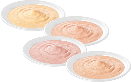ATUM E CAMARÃO: composição básica: Carne de atum 58%, carne de frango 12%, camarão integral 18%, amido de mandioca 8%, taurina 2,5%, goma xantana, extrato de chá verde, vitaminas (A, B2, B3, B5, D3, E).